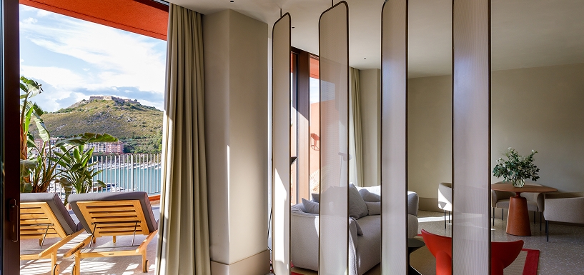 Rooms and suites are bright and uncluttered, many with private terraces overlooking either the harbor or the surrounding greenery. Materials are simple but elevated — linen, stone, wood — creating a calm and tactile atmosphere.